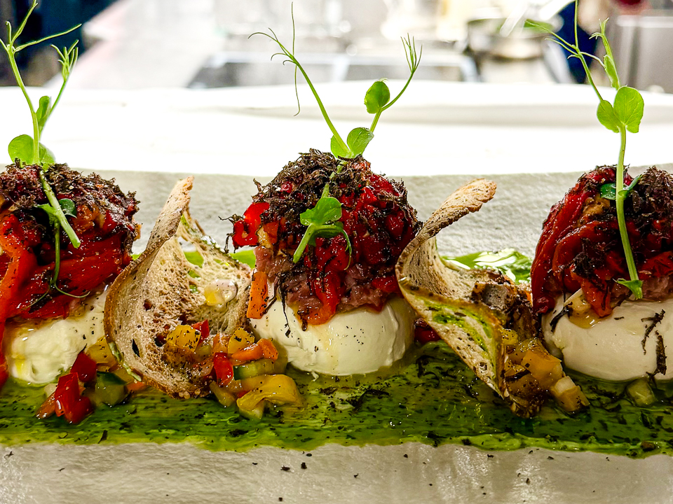 gefüllt mit Black-Angus-Tatar dazu über Holzkohle gegrillte rote Paprika, fein mariniert mit Sardella aus Kantabrien und schwarzem Trüffel